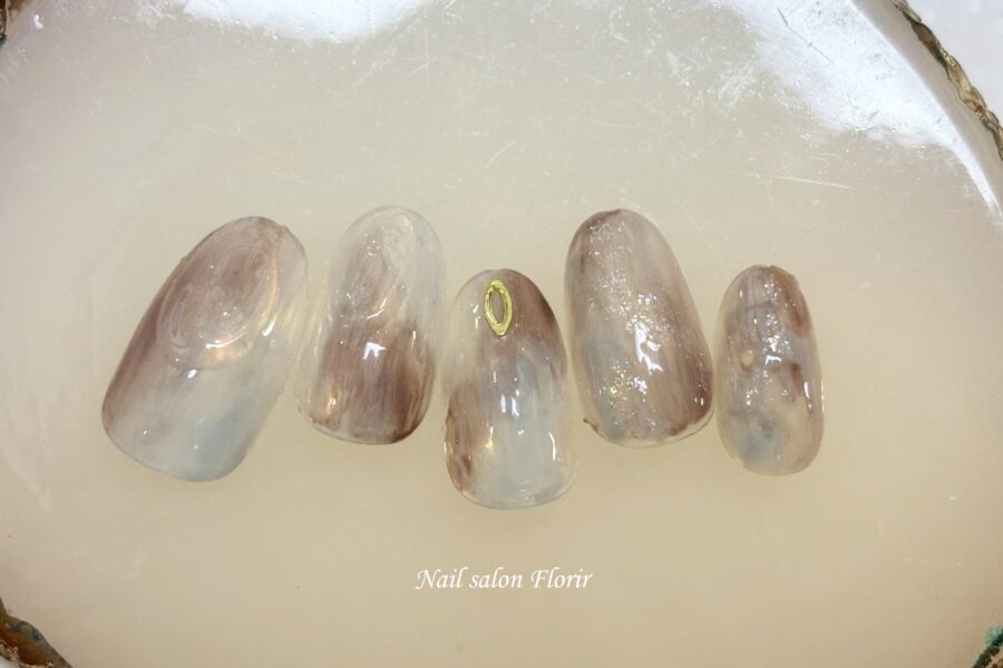 Nail Design2059 施術内容 Hand ジェルアート ベースデザイン Nuance カラー Brown アート・パーツ Mirror 価格 ¥8500 256、Ami219、A006、ラメホワイト