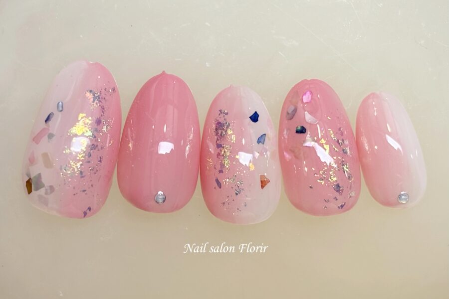 Nail Design2068 施術内容 Hand ジェルアート ベースデザイン Gradation カラー Pink アート・パーツ gritter 価格 ¥6980 BW,Tint04,フレークイエロー