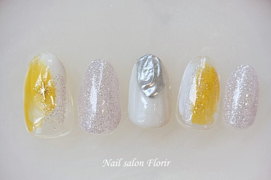 Nail Design2078 施術内容 Hand ジェルアート ベースデザイン Nuance カラー Beige・White・Yellow アート・パーツ Stones・Glitter・Icing Mirror 価格 ¥6980 252,143,Flash10