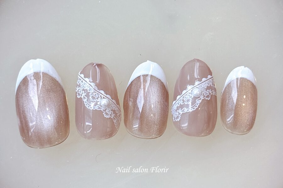 Nail Design2081 施術内容 Hand ジェルアート ベースデザイン French カラー Beige・White アート・パーツ Stickers・Magnet 価格 ¥8500 MM03,FW,A006