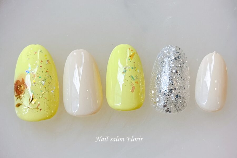 Nail Design2087 施術内容 Hand ジェルアート ベースデザイン One Color カラー Yellow・White アート・パーツ Glitters・Sticker 価格 ¥5980 V003,E21,LBラメ