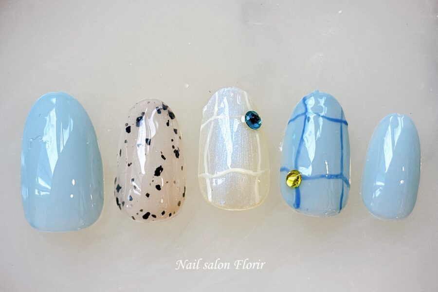 Nail Design2089 施術内容 Hand ジェルアート ベースデザイン One Color カラー Blue・Beige アート・パーツ Stones・Glitter・Art 価格 ¥6980 256,J1,Mica4,C19,E29