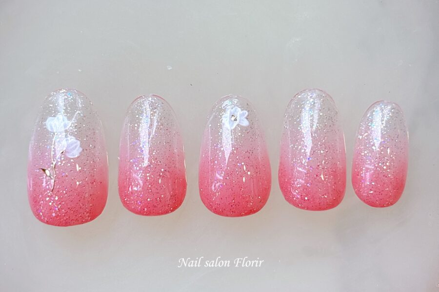 Nail Design2092 施術内容 Hand ジェルアート ベースデザイン Gradation カラー Pink アート・パーツ Glitters・Sticker 価格 ¥6980 E1,Amici600