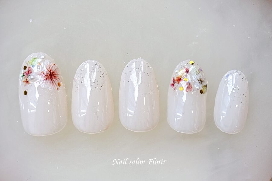 Nail Design2094 施術内容 Hand ジェルアート ベースデザイン One Color カラー White アート・パーツ Glitters・Pearls・Sticker 価格 ¥5980 B10,I5