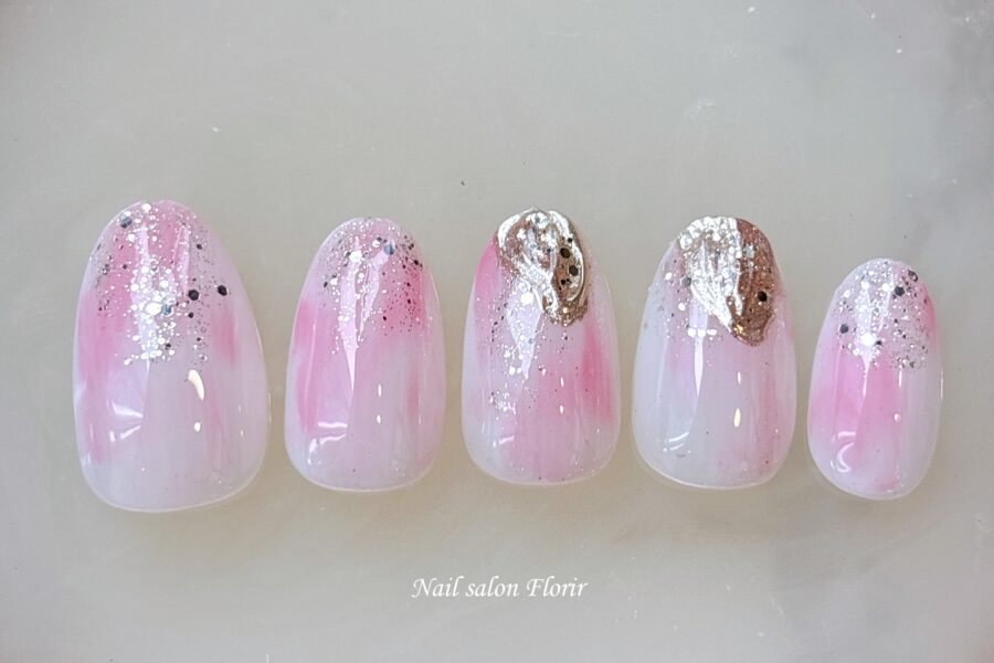 Nail Design2095 施術内容 Hand ジェルアート ベースデザイン Nuance カラー Pink・White・Gold アート・パーツ Glitters・Icing mirror 価格 ¥6980 BW,E1,ミラーD,シルバー1