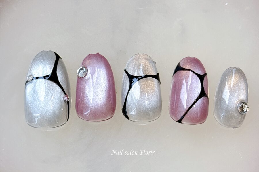 Nail Design2098 施術内容 Hand ジェルアート ベースデザイン One Color カラー Purple・Silver アート・パーツ Stones・Magnet 価格 ¥8500 MM1,MM7,黒