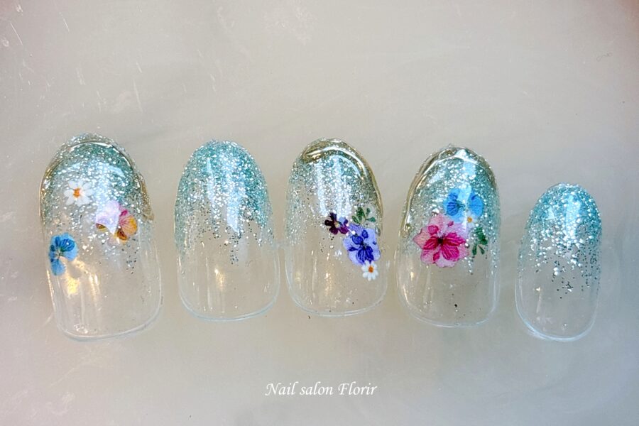 Nail Design2102 施術内容 Hand ジェルアート ベースデザイン Gradation カラー Blue アート・パーツ Icing Mirror・Glitters・Sticker 価格 ¥6980 ラメ12、ミラーD